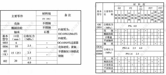 小型流量計(jì)主要材料及公稱壓力 標(biāo)準(zhǔn)型流量計(jì)主要構(gòu)件材料及公稱壓力